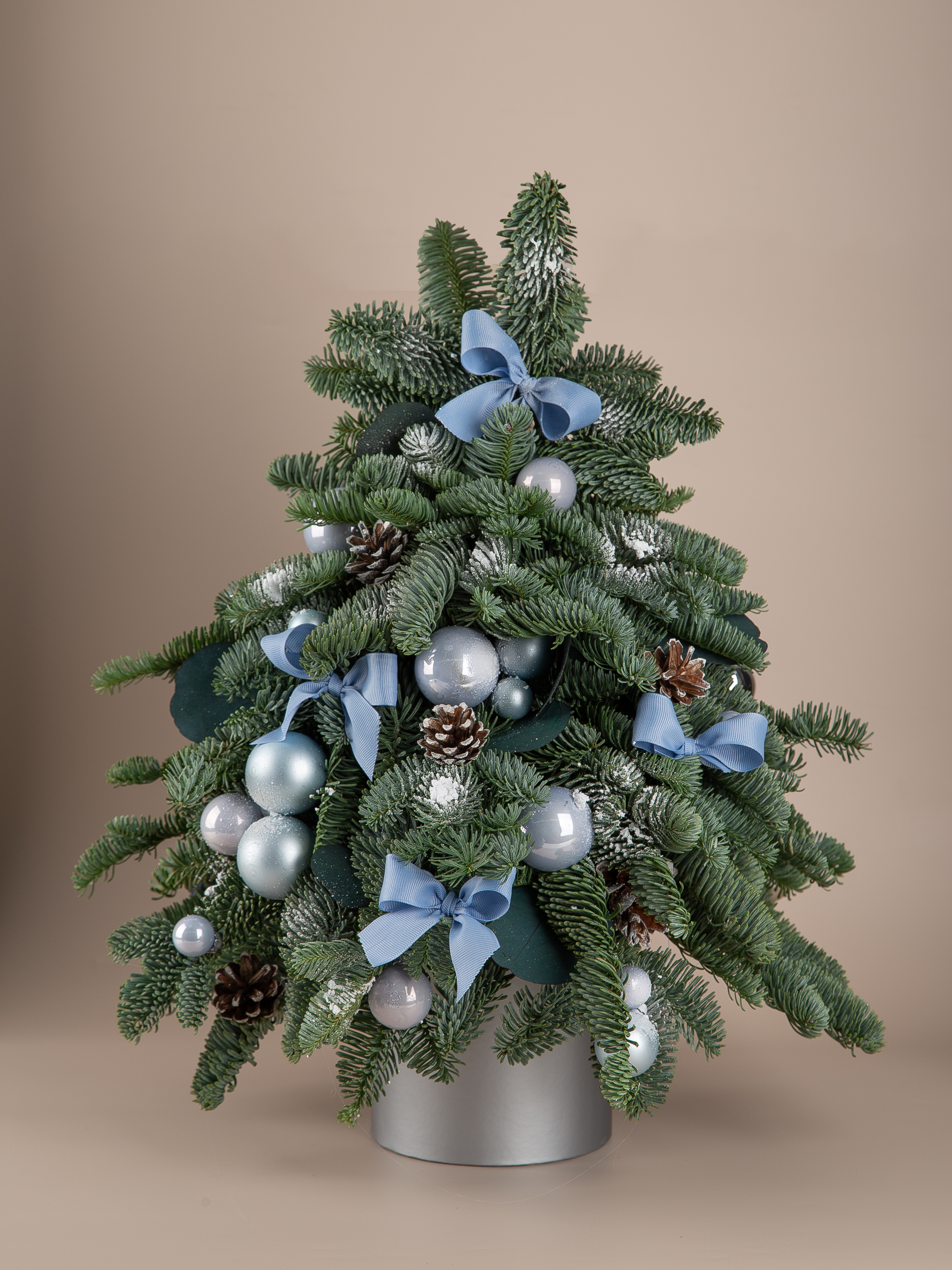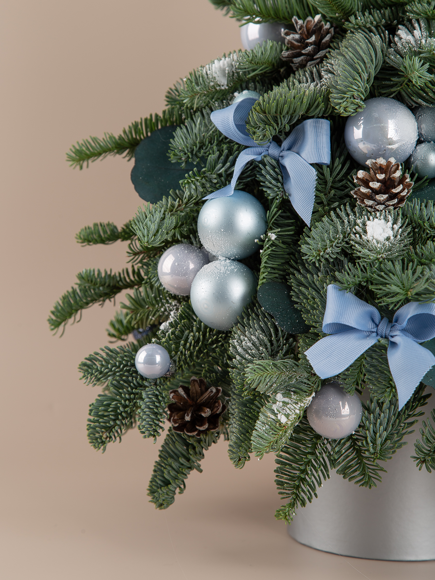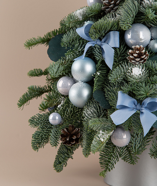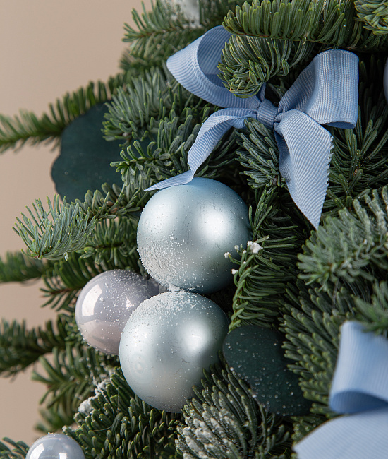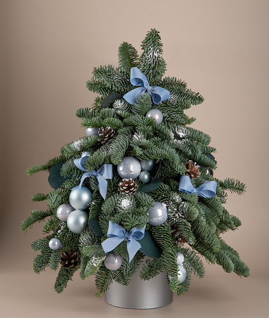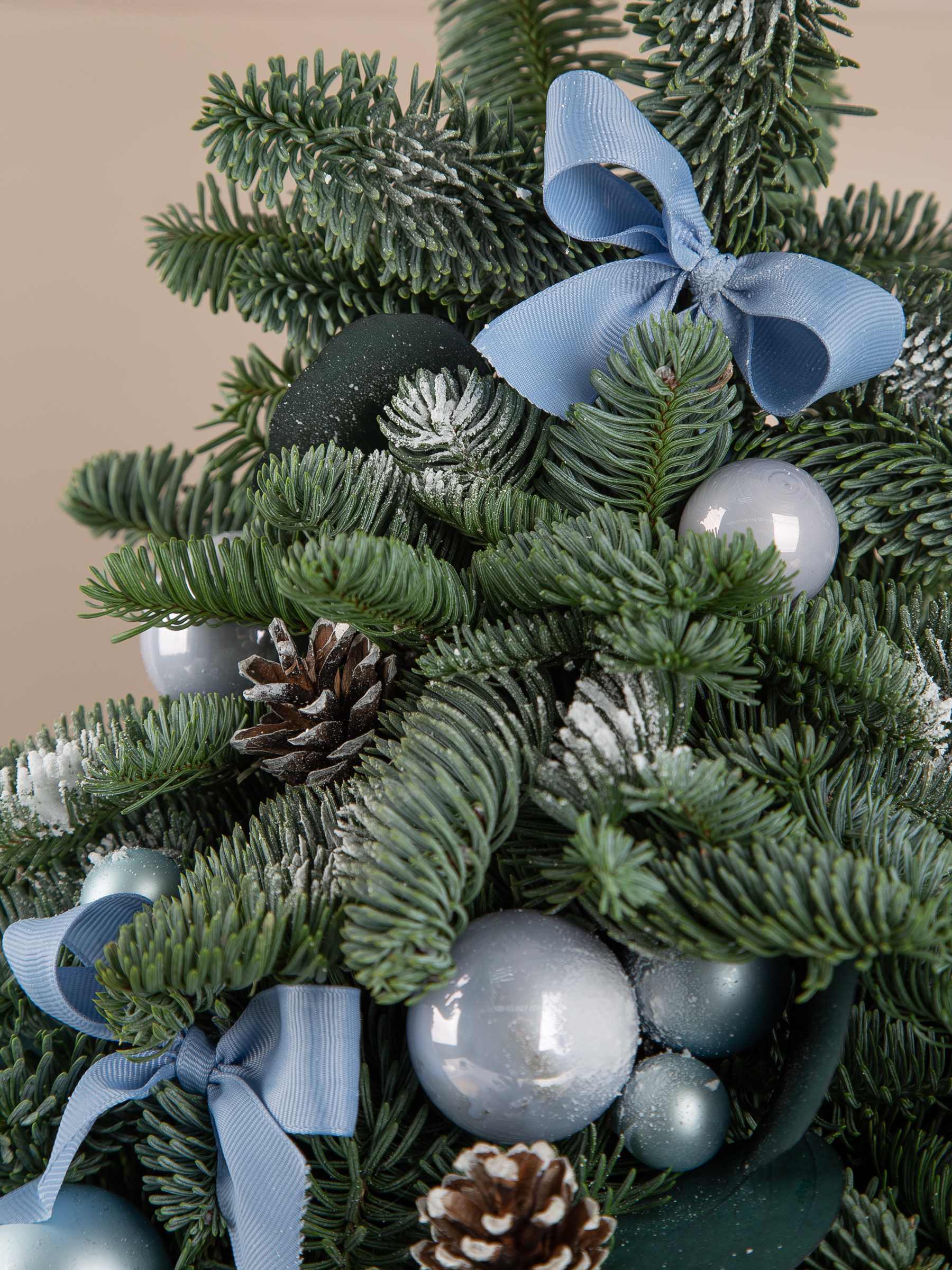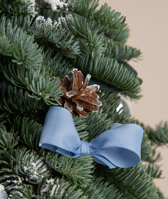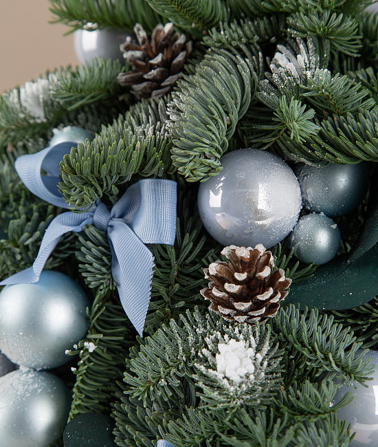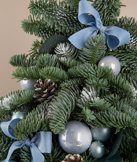 Елочка из датской ели Нобилиса. Нежная елочка с елочными игрушками, декорирована шишками, бантами и искусственным снегом.