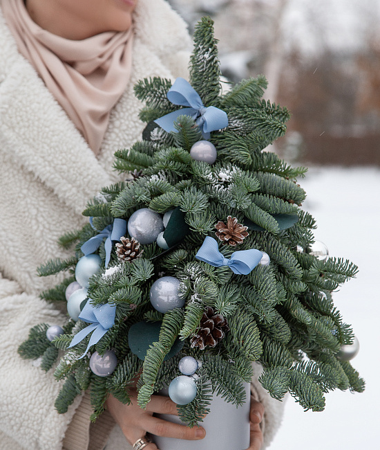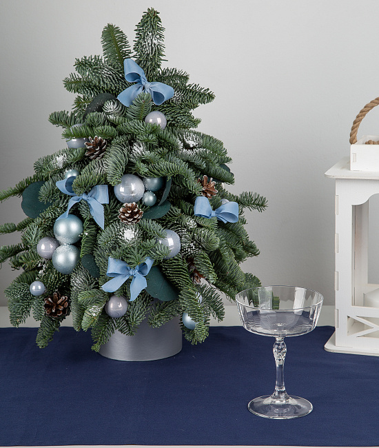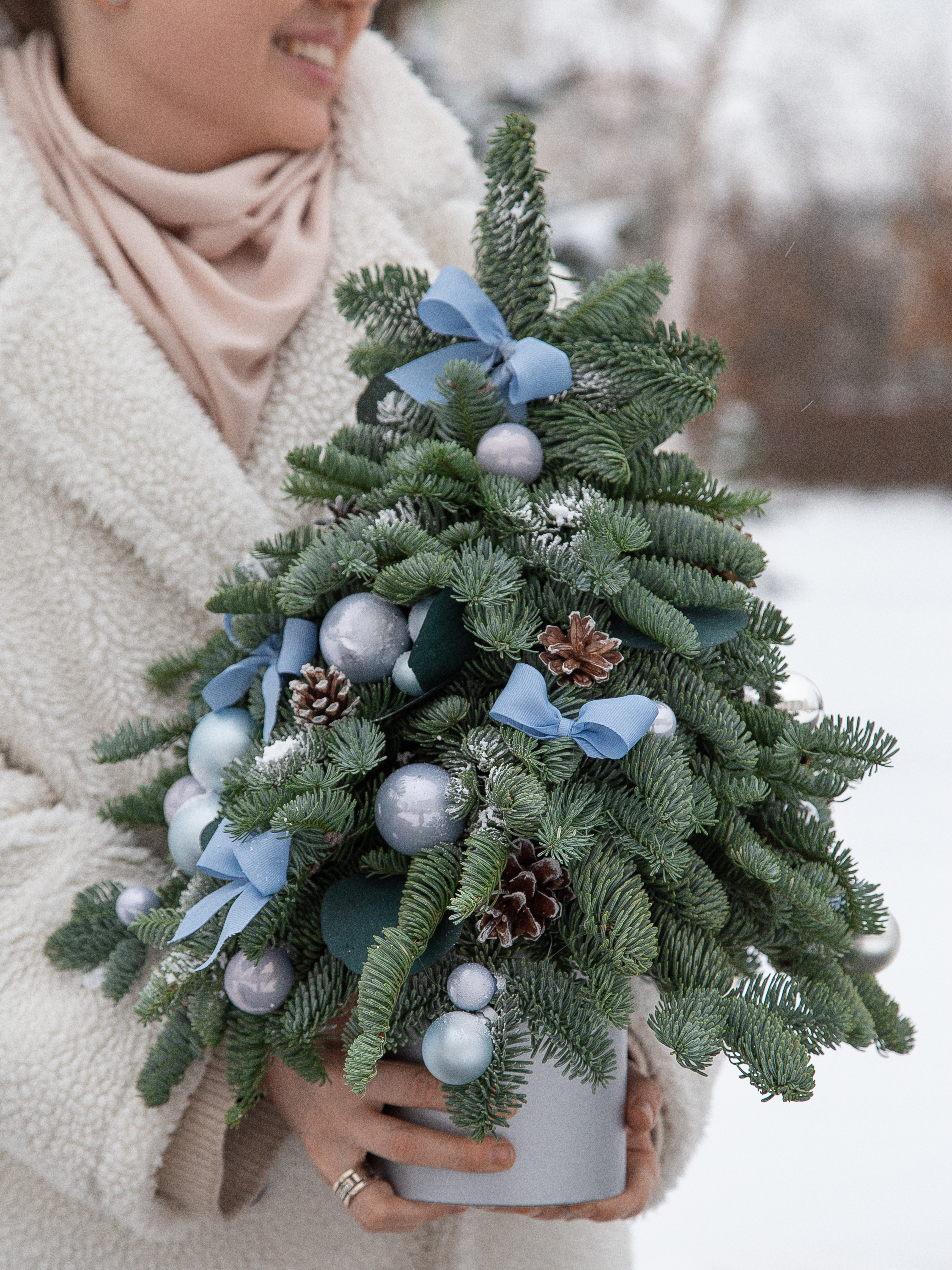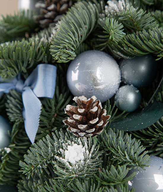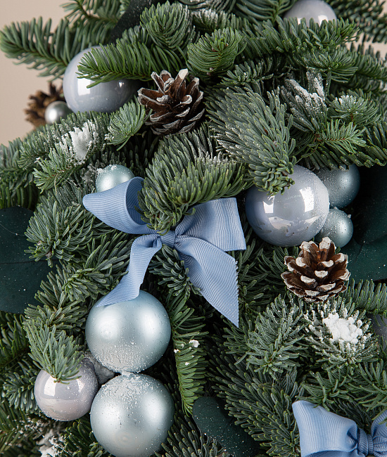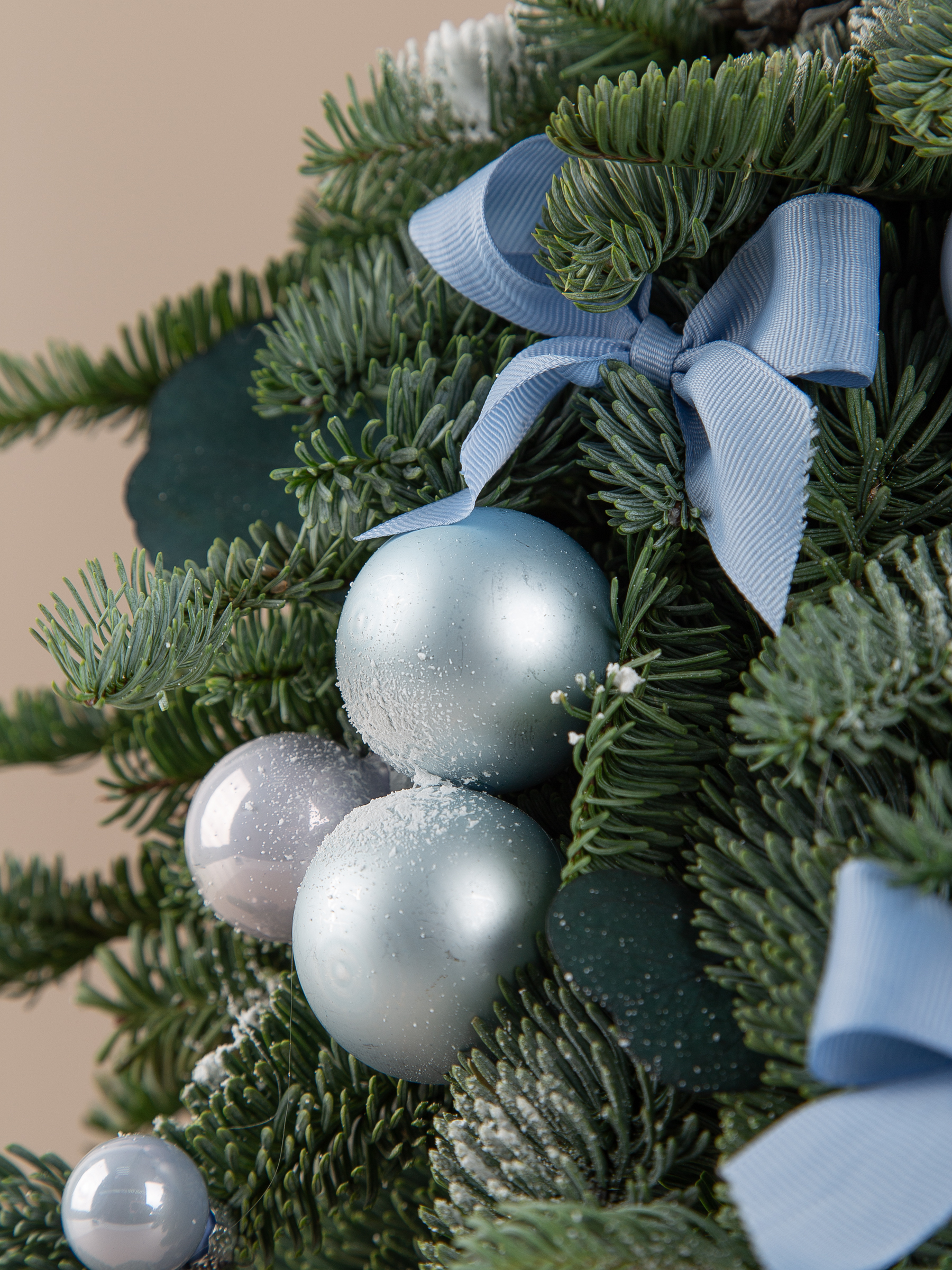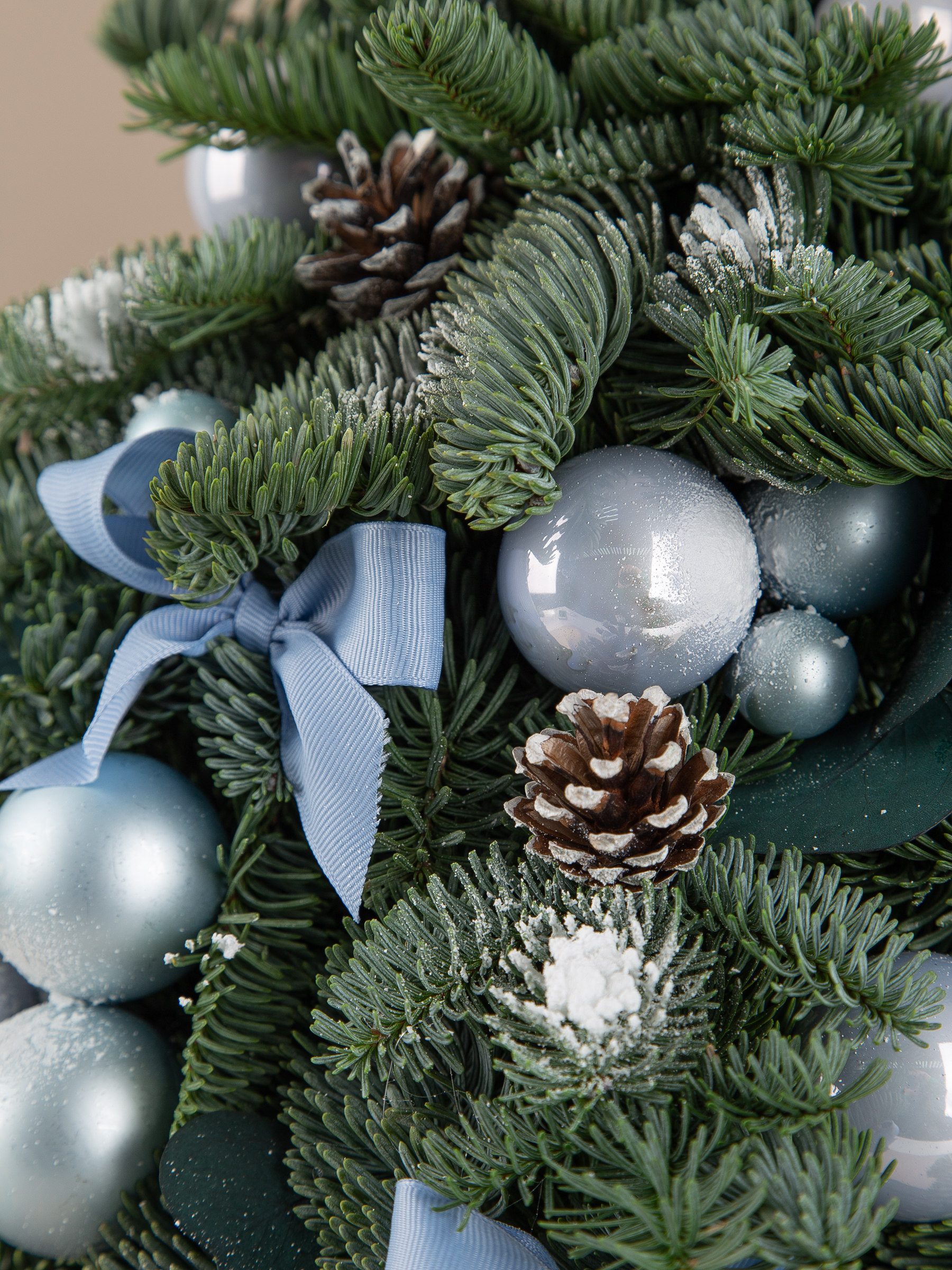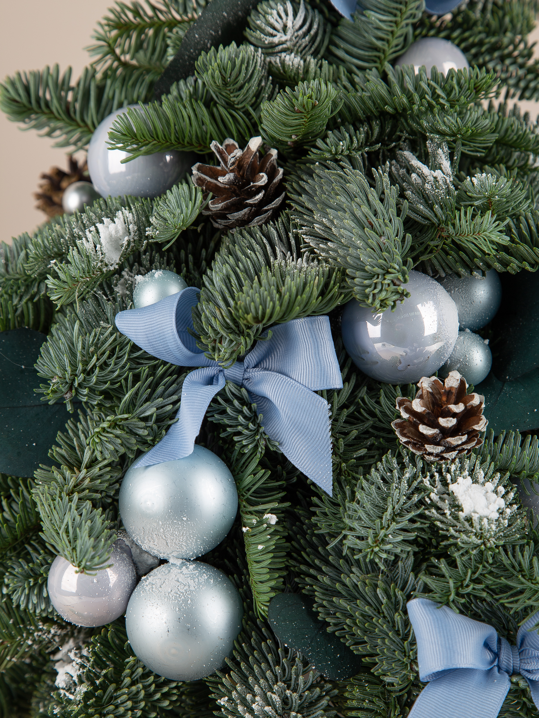 Елочка из датской ели Нобилиса. Нежная елочка с елочными игрушками, декорирована шишками, бантами и искусственным снегом.