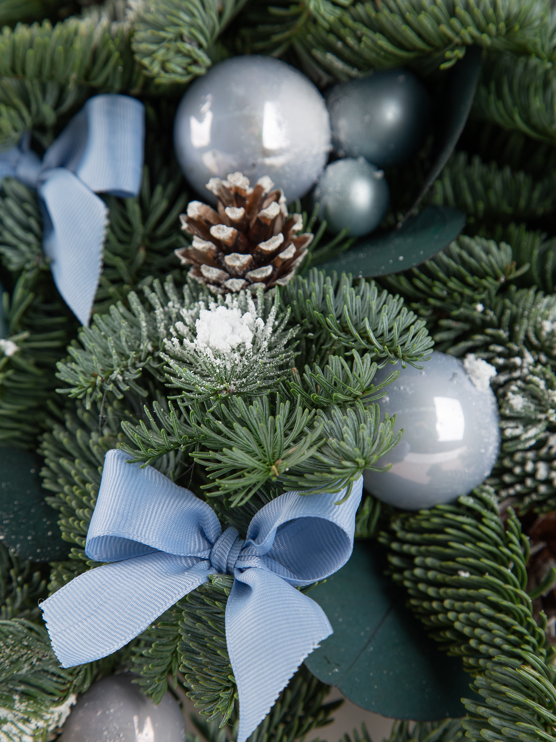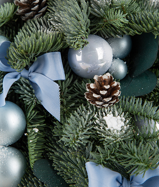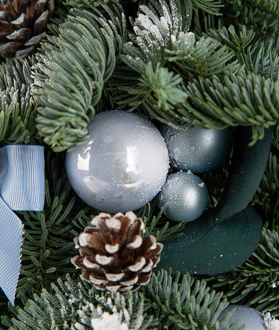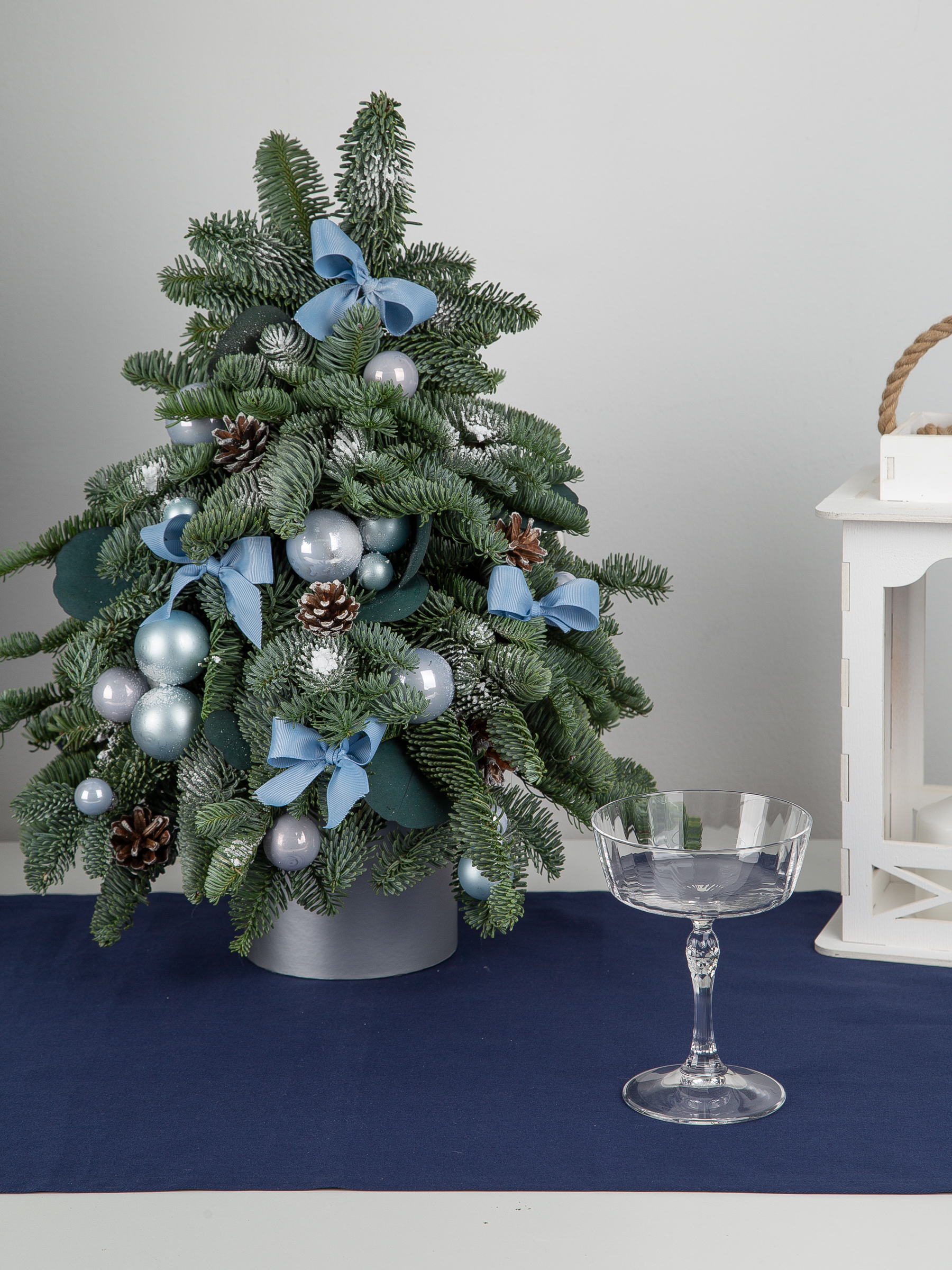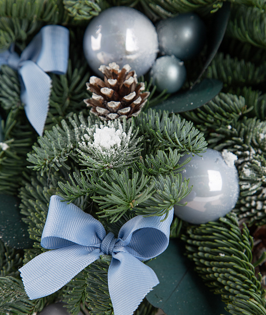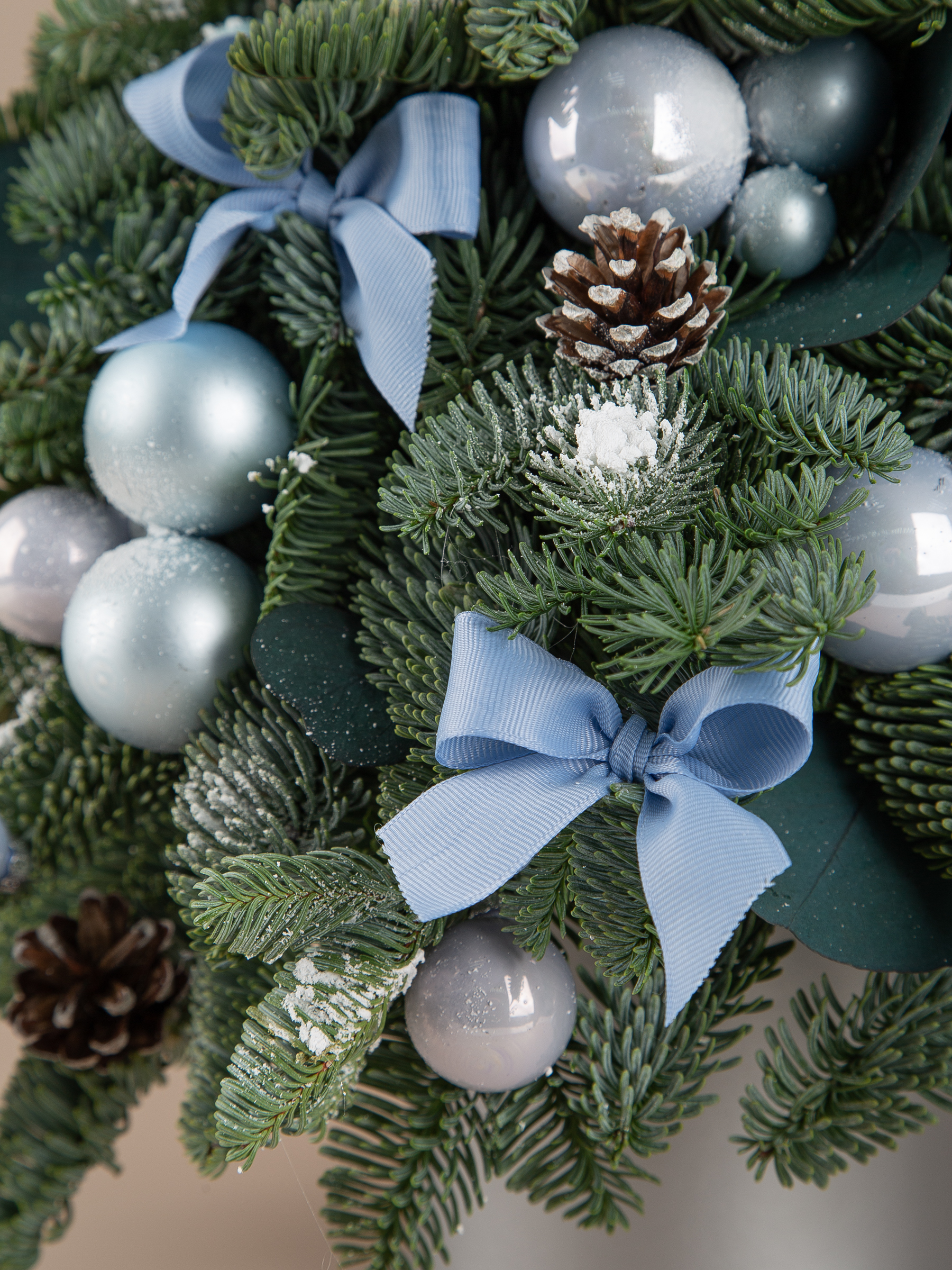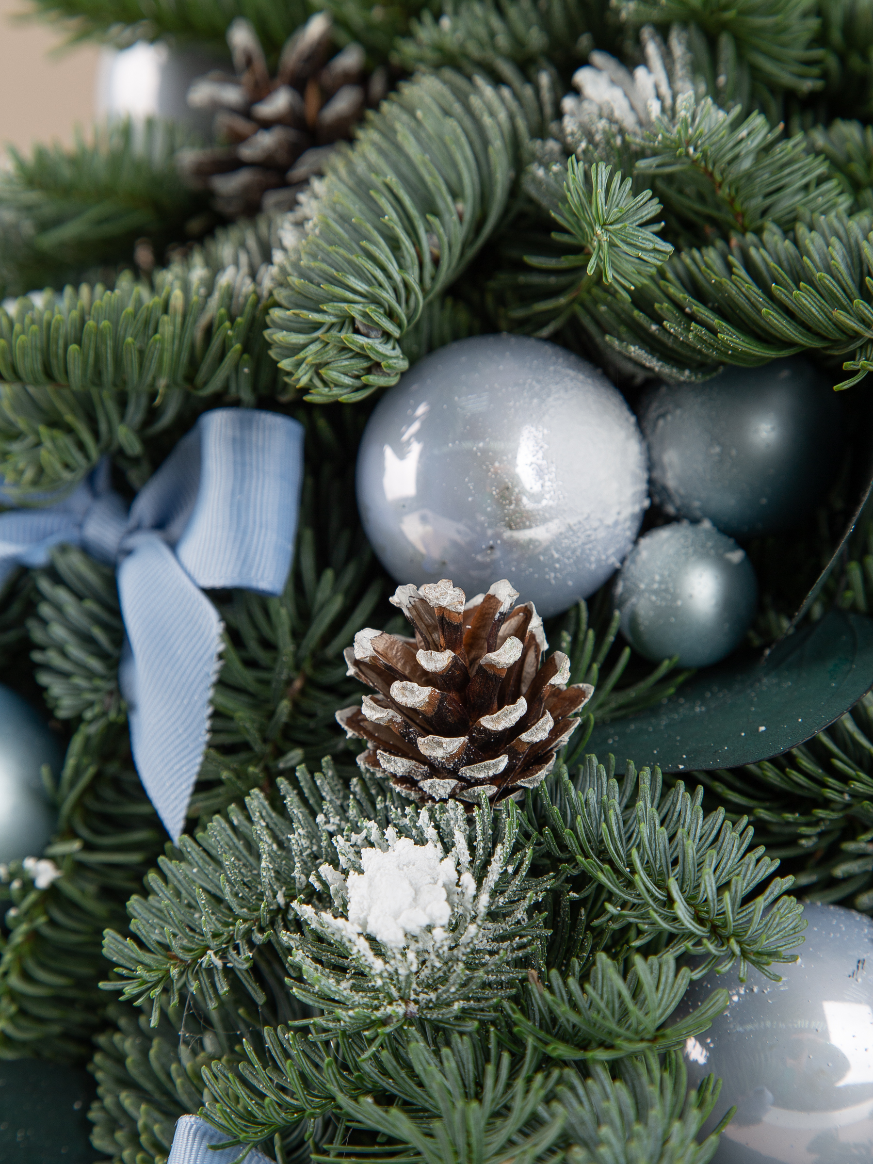 Елочка из датской ели Нобилиса. Нежная елочка с елочными игрушками, декорирована шишками, бантами и искусственным снегом.