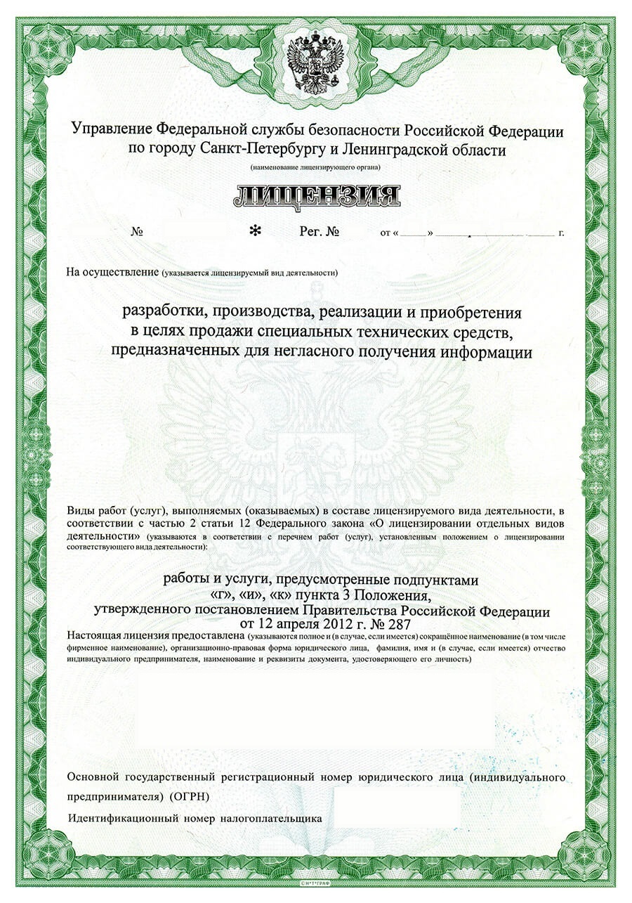 Лицензия на разработку, производство, реализацию и приобретение в целях продажи специальных технических средств, предназначенных для негласного получения информации.