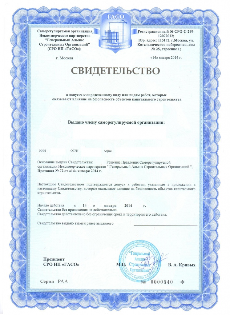 Свидетельство о допуске к определенному виду работ, которые оказывают влияние на безопасность объектов капитального строительства.