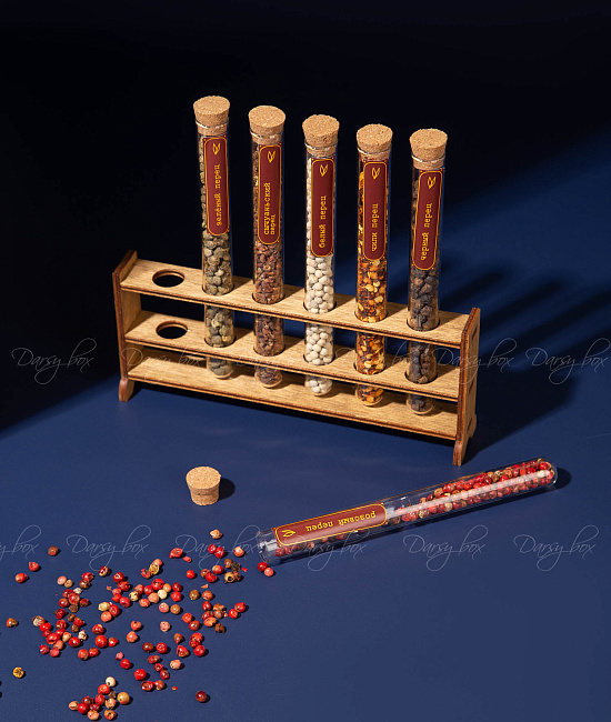 • Набор специй в пробирках в деревянной подставке – 6 штук (разные виды перца горошком)
