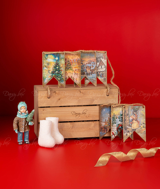 • гирлянда флажки деревянные с атмосферными картинками ручной работы в технике декупаж (возможен свой дизайн флажков в корпоративном стиле)