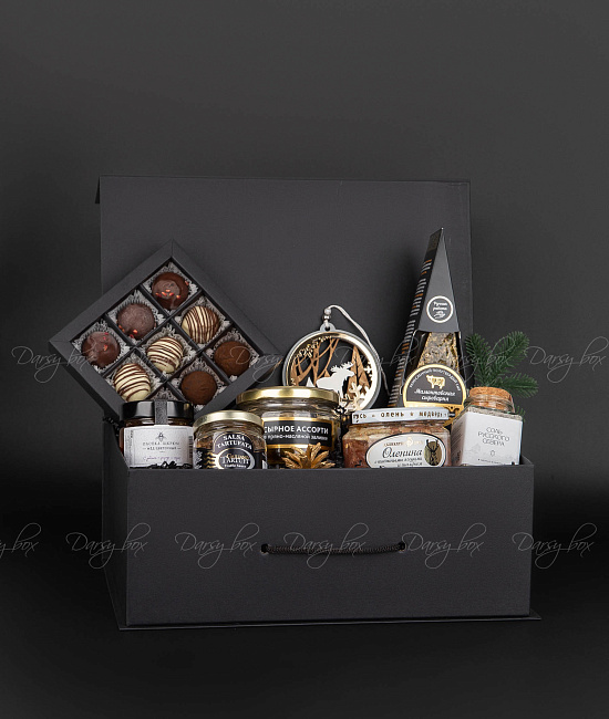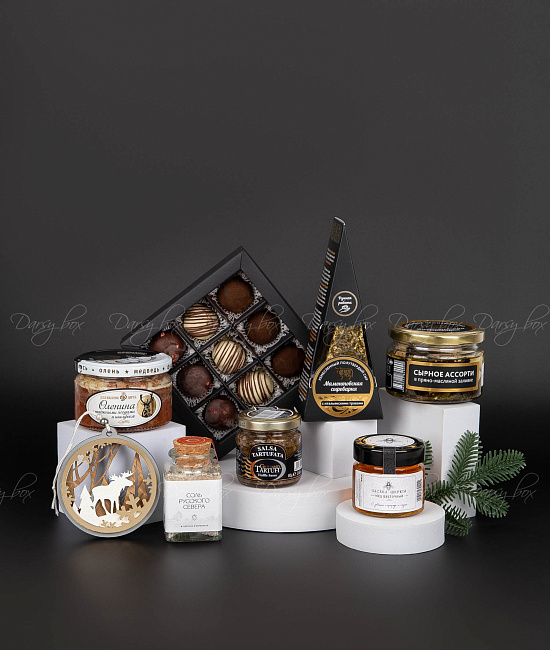 • Сырное ассорти в пряно-масляной заправке – 250 г   • Оленина томленая с лесными ягодами и шалфеем – 220г, стекло