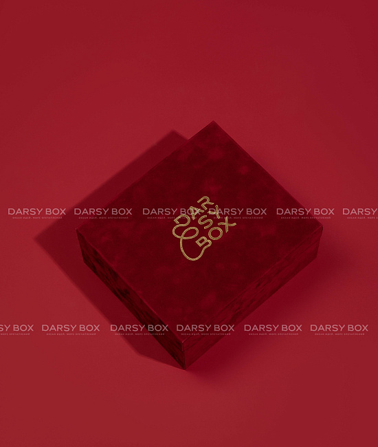 • Коробка дизайнерская 24х21х13 см (бархатная) с ложементом красная с золотым тиснением с лого клиента