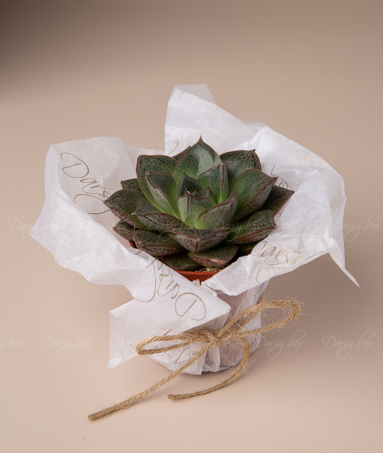 • суккулент в пластиковом горшочке, задекорированном бумагой тишью