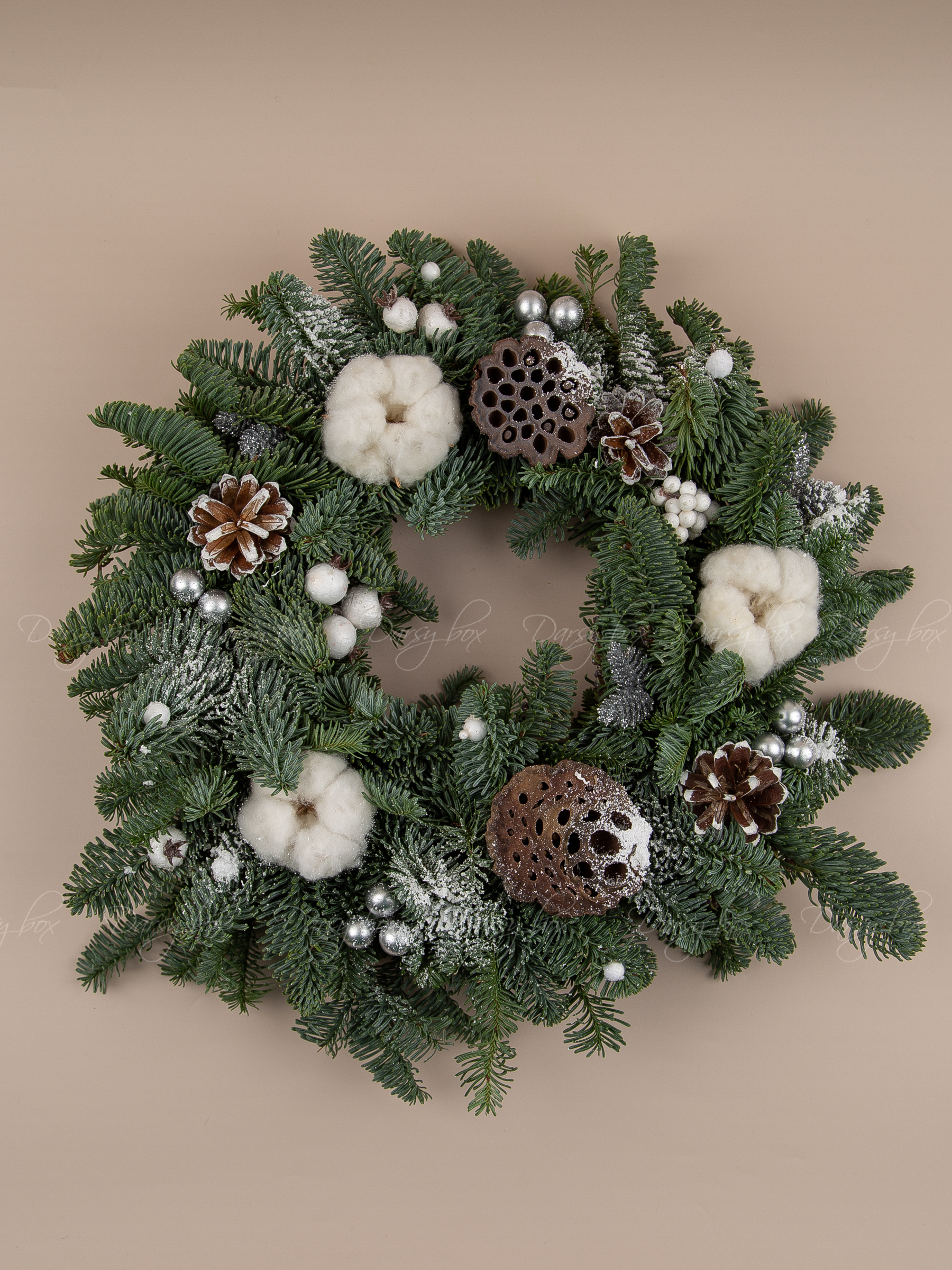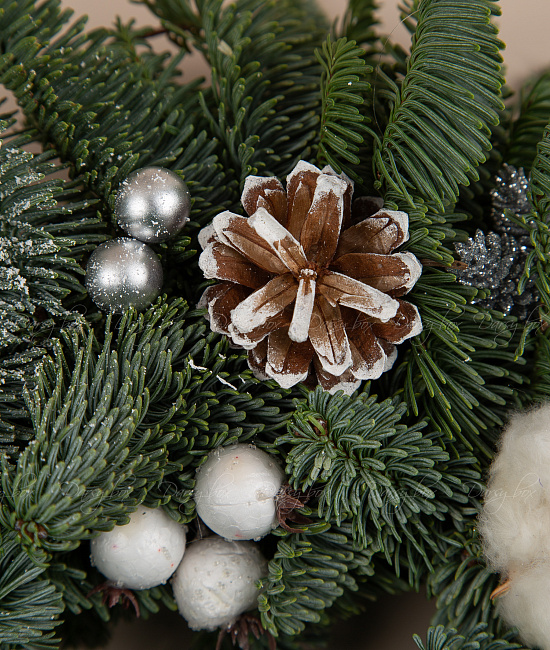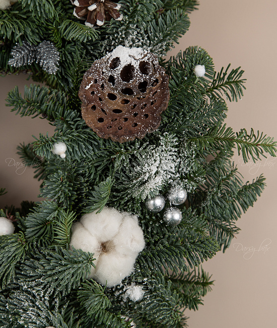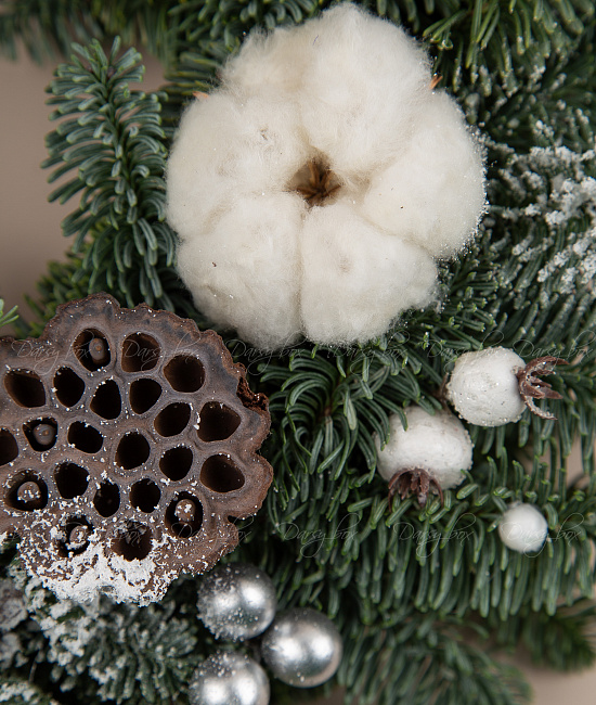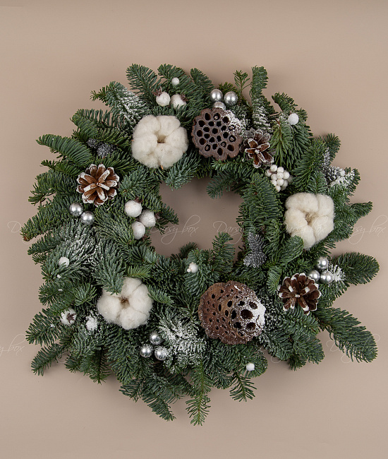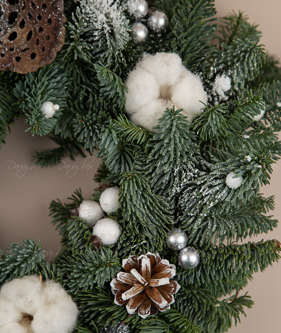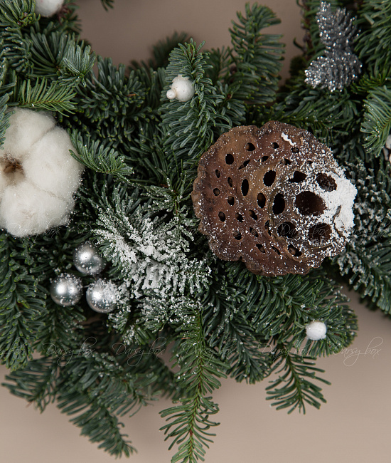 Еловый венок из нобилиса с хлопокм, шишками и лотосом. еловый венок из Нобилиса (это живая ель, специально выращиваемая для флористики, она не сыпется и имеет прекрасный аромат)