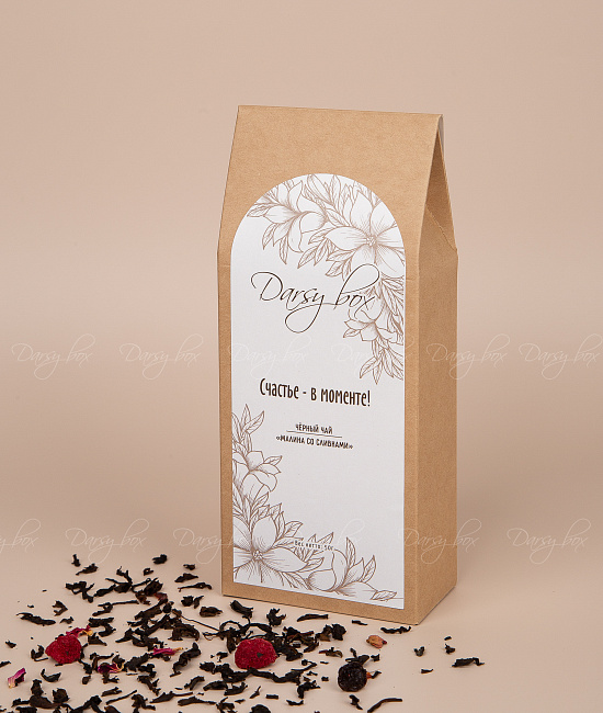 • чай "Счастье в моменте"  50 г (Купаж на основе черного вьетнамского чая с добавлением ягод малины, цедры шиповника, черной вишни, лепестков роз и ароматом спелой малины и ванильных сливок)